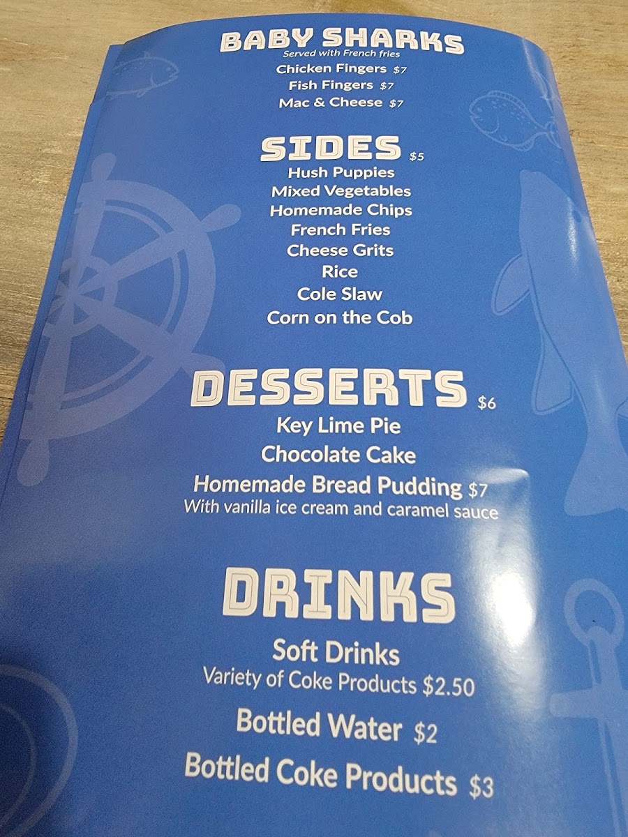 The menu features standout options such as the Family Fish Feast, perfect for gatherings, with choices like shrimp, mahi mahi, salmon, and snapper. Each feast includes two sides and delicious hush puppies, ensuring a fulfilling experience for families.
